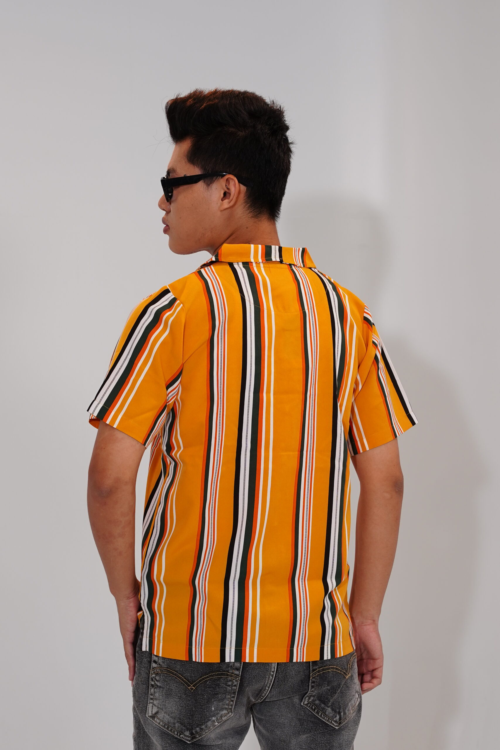 Vibrant and stylish short sleeve shirt featuring bold vertical stripes on a yellow base. Made from breathable fabric with a relaxed fit, perfect for casual wear.